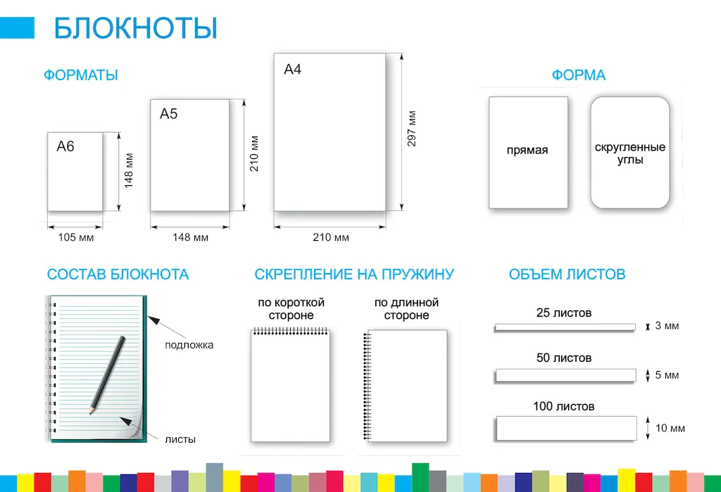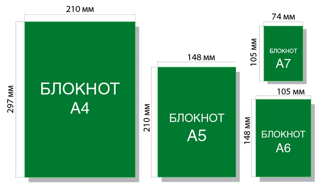 Объём зависит от назначения. Например, модели на 40–60 листов подходят для кратких записей. Варианты на 80–120 страниц используют как ежедневники. Толстые блокноты с 200 листами применяют для конспектов. Все размеры и количество листов согласованы с международными стандартами.