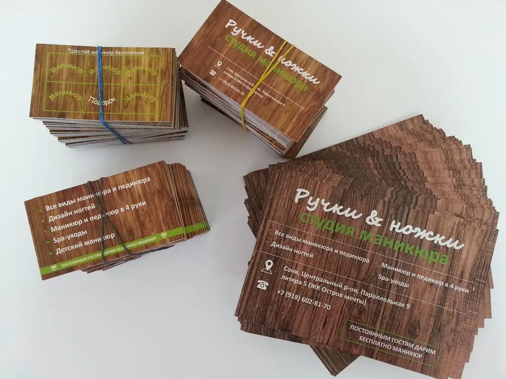 Даже для ста экземпляров доступны разные варианты отделки. Вы можете заказать полноцветные визитки с фотографиями или сложной графикой. Популярный вариант — печать с двух сторон, что позволяет разместить больше информации. Для солидного образа выбирают дизайнерскую бумагу с фактурной поверхностью. Тактильные ощущения важны, ведь визитку сначала берут в руки. Матовая или глянцевая ламинация защитит текст от истирания и придаст изделию завершённый вид.