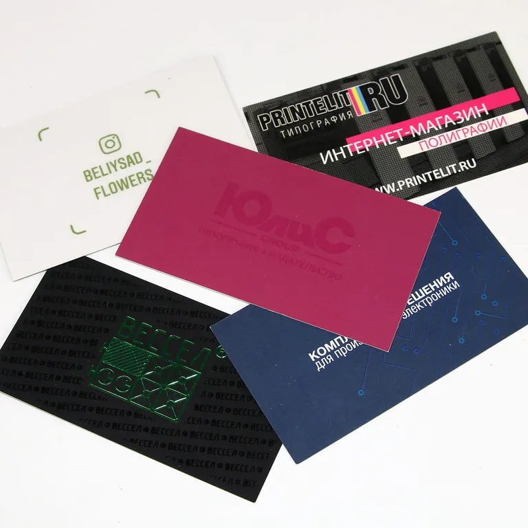 Изготовление визиток с ламинацией открывает простор для креатива. Помимо выбора покрытия, можно использовать: