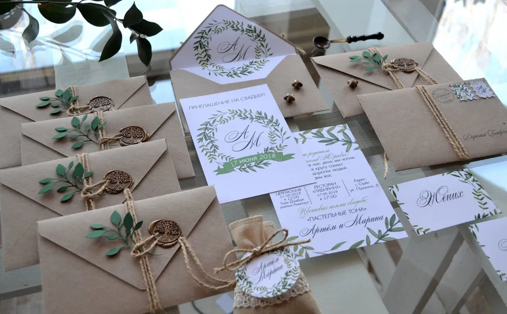 - приглашения-открытки в конвертах из крафт-бумаги;