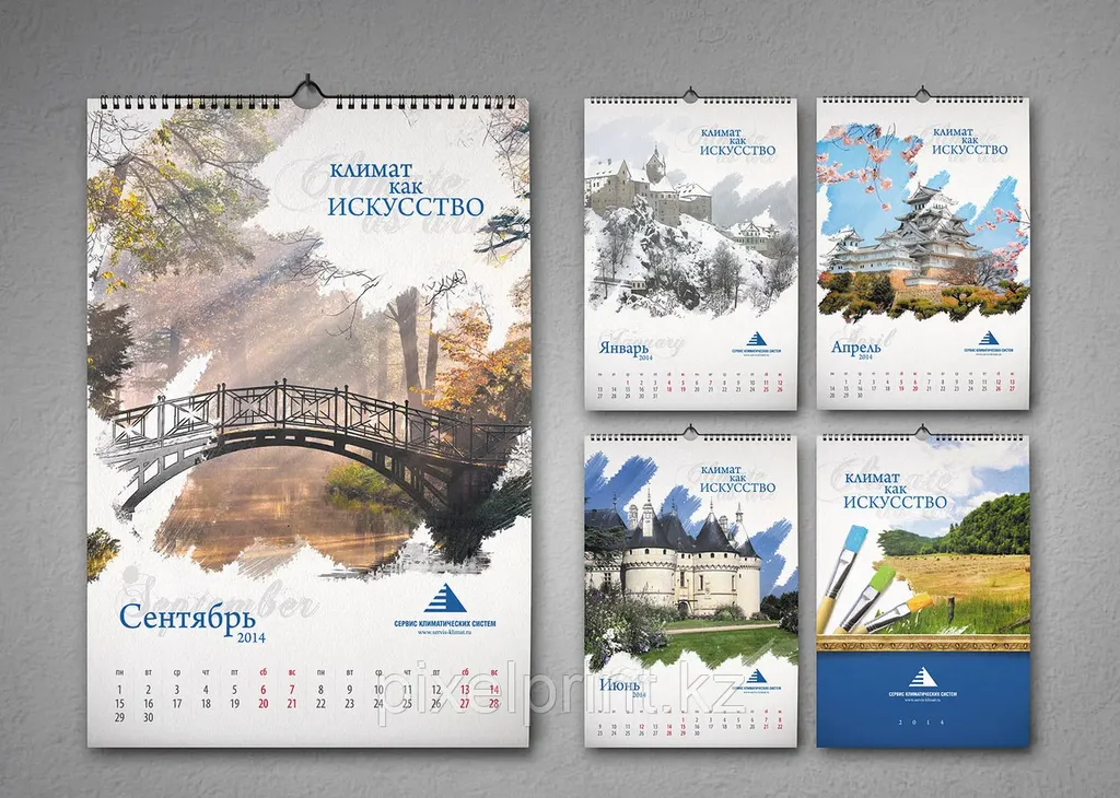 Такой продукт — инструмент продвижения. Ваш бренд весь год на виду у клиентов и сотрудников. Логотип и контакты размещают на каждом листе. Дизайн отражает ценности компании. Корпоративный календарь формата А2 говорит о серьёзности и стабильности. Его дарят партнёрам на Новый год.