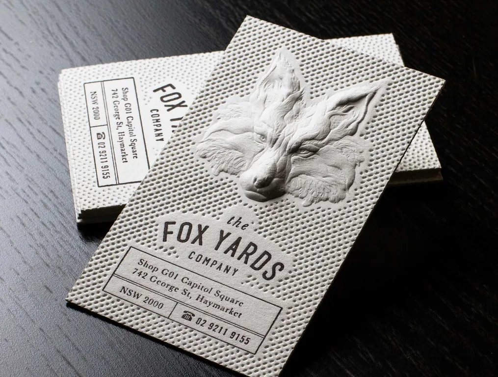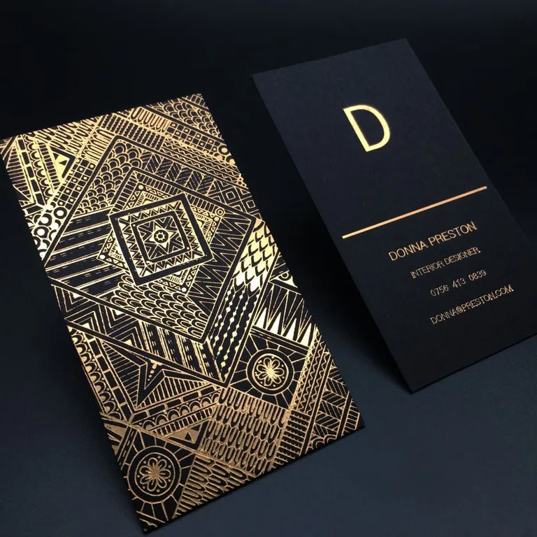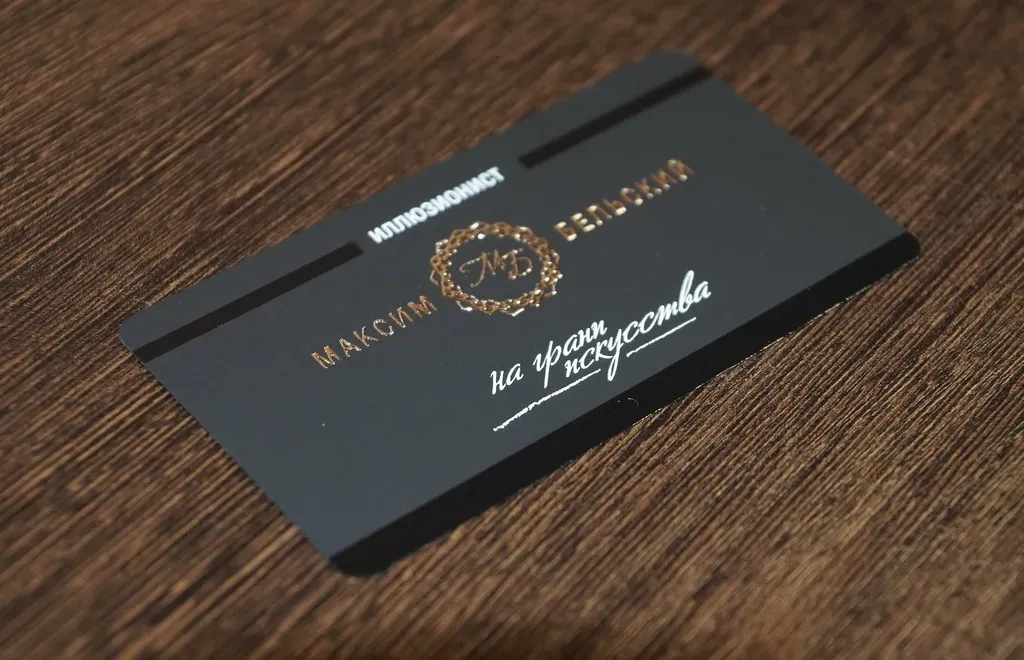 Премиум-визитки часто имеют фигурную вырубку. Контур может повторять форму логотипа или быть абстрактным. Такой подход сразу привлекает внимание. Ещё один приём — сквозное тиснение фольгой, которое создаёт эффект глубины и luxury-ощущение.