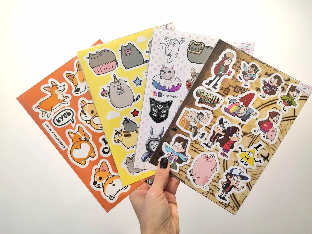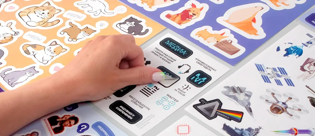 Разработка макета — первый и самый творческий этап. Важно создать не просто картинку, а запоминающийся визуал, который захочется сохранить. Для брендов это часто логотип или фирменный персонаж в разных вариациях. Блогеры и творческие сообщества заказывают стикерпаки с авторской графикой, персонажами из контента или мотивирующими цитатами. Популярны тематические наборы: космические, растительные, музыкальные или умиротворяющие абстракции. Печать полноцветных наклеек позволяет передать все оттенки и градиенты вашей идеи.