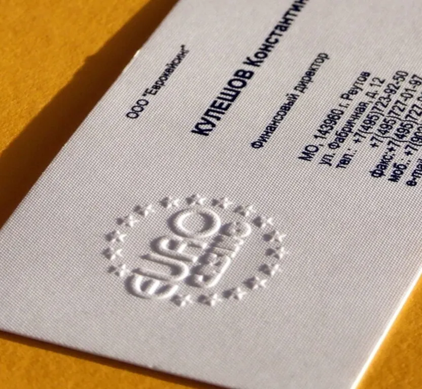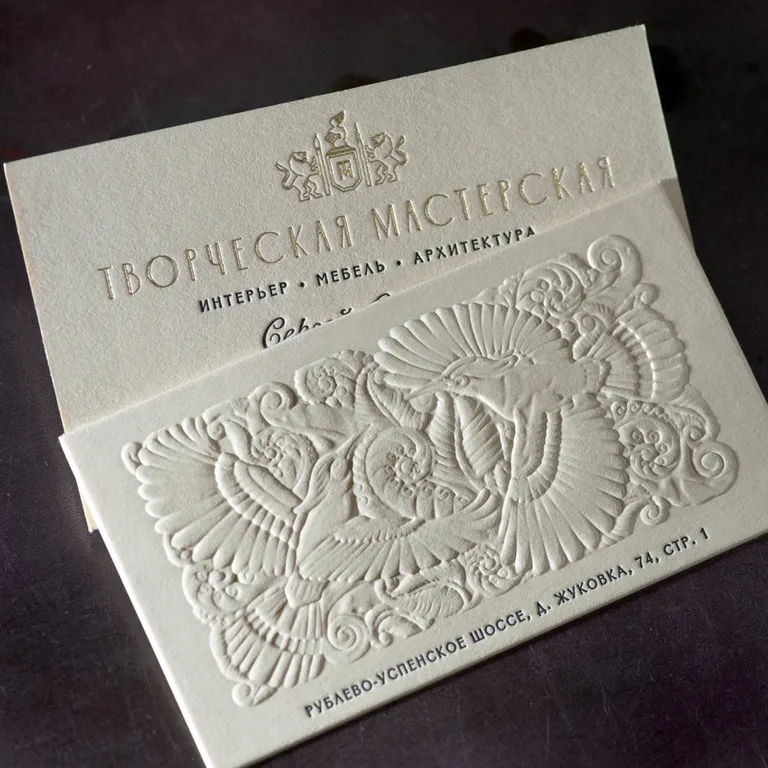 Конгревная печать создаёт чёткий объём без использования краски. Элементы приподнимаются над поверхностью картона за счёт специального пресса. Это классическая технология для премиальных и брендовых визиток. Она подчеркивает важность информации и работает на имидж.